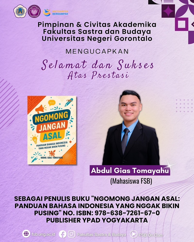 fsb.ung.ac.id, Gorontalo – Prestasi akademik kembali ditorehkan oleh mahasiswa Fakultas Sastra dan Budaya (FSB) Universitas Negeri Gorontalo (UNG). Abdul Gias Tomayahu, mahasiswa Jurusan Pendidikan Bahasa dan Sastra Indonesia (PBSI) ini berhasil menerbitkan sebuah buku berjudul Ngomong Jangan Asal: Panduan Bahasa Indonesia yang Nggak Bikin Pusing. Buku tersebut diterbitkan oleh YPAD Yogyakarta dan telah resmi memiliki ISBN 978-638-7261-67-0. […]