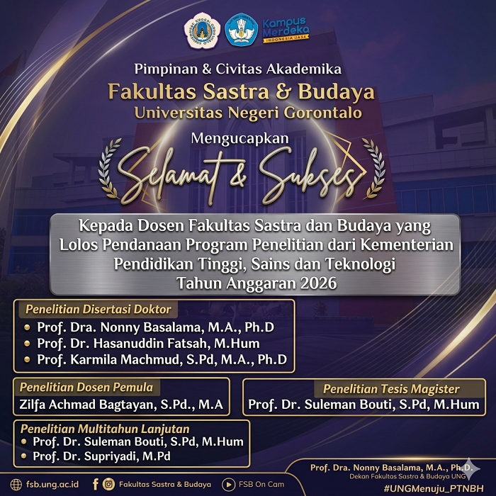 fsb.ung.ac.id, Gorontalo – Prestasi membanggakan kembali ditorehkan oleh para dosen Fakultas Sastra dan Budaya (FSB) Universitas Negeri Gorontalo (UNG). Sejumlah akademisi berhasil lolos pendanaan Program Penelitian Tahun Anggaran 2026 yang diselenggarakan oleh Kementerian Pendidikan Tinggi, Sains dan Teknologi. Keberhasilan ini menjadi bukti nyata peningkatan kualitas riset dan kontribusi akademik dari para dosen.