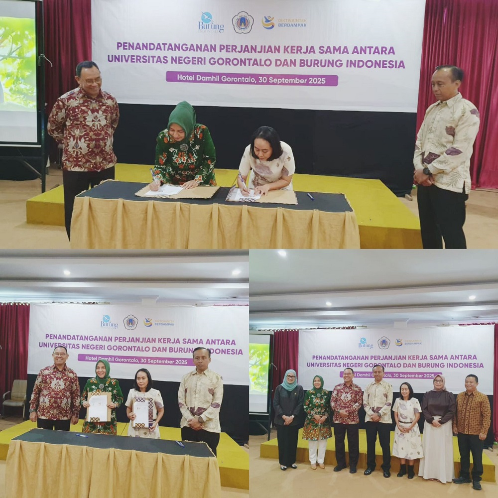fsb.ung.ac.idGorontalo – Dekan Fakultas Sastra dan Budaya (FSB) Universitas Negeri Gorontalo (UNG), Prof. Dra. Nonny Basalama, MA., Ph.D., didampingi oleh Wakil Rektor IV Bidang Perencanaan, Kerjasama dan Sistem Informasi UNG, Dr. Harto S. Malik, M.Hum., melaksanakan penandatanganan Perjanjian Kerja Sama (PKS) dengan Perhimpunan Pelestarian Burung Indonesia (PBI). Kamis (30/09/2025), di Hotel Damhil UNG.