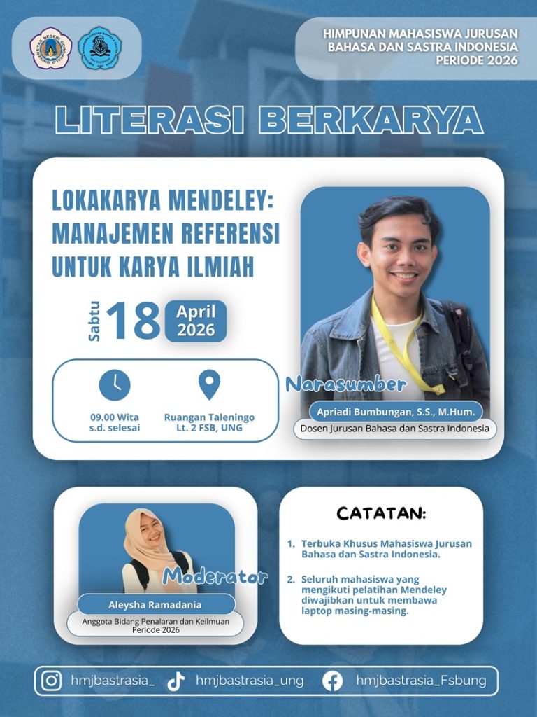fsb.ung.ac.id, Gorontalo – Jurusan Bahasa dan Sastra Indonesia, (Bastrasia) Fakultas Sastra dan Budaya (FSB), Universitas Negeri Gorontalo (UNG) menggelar lokakarya bertajuk “Mendeley: Manajemen Referensi untuk Karya Ilmiah” pada Sabtu, 18 April 2026. Kegiatan ini menjadi langkah strategis dalam memperkuat literasi akademik mahasiswa di era digital.